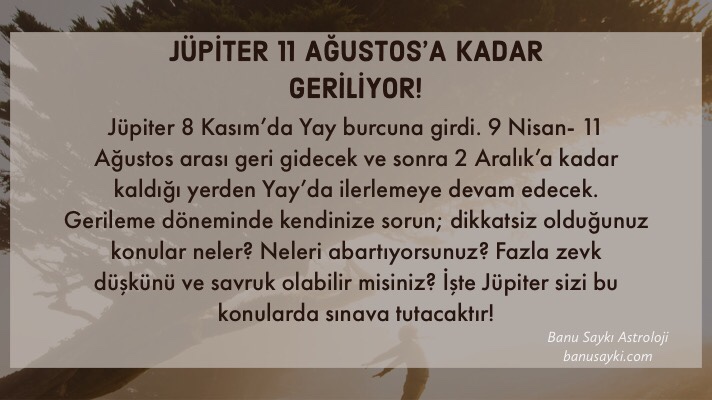 Güzele güzel demem güzel benim değilse!” 😜 Jüpiteri göklere çıkarmamak, Satürn’ü hor görmemek lazım. Gerileme döneminde kendinize sorun; dikkatsiz olduğunuz konular neler? Neleri abartıyorsunuz? Fazla zevk düşkünü ve savruk olabilir misiniz? İşte Jüpiter sizi bu konularda sınava tutacaktır! Her gezegenin olumlu olumsuz enerjisi var. Bugünlerde sorun kendinize: neye ihtiyacınız var? Ya da belki daha önemlisi neye ihtiyacınız yok? Hangi konularda kibir ve açgözlülük yapıyorsunuz? Neleri abartıyorsunuz? Sizde şişkinlik yapan yedikleriniz mi, üstünüzdeki marka mı? Ne? Unutmayın; her sorunun içinde bir fırsat, her fırsatın içinde bir sorun vardır!
